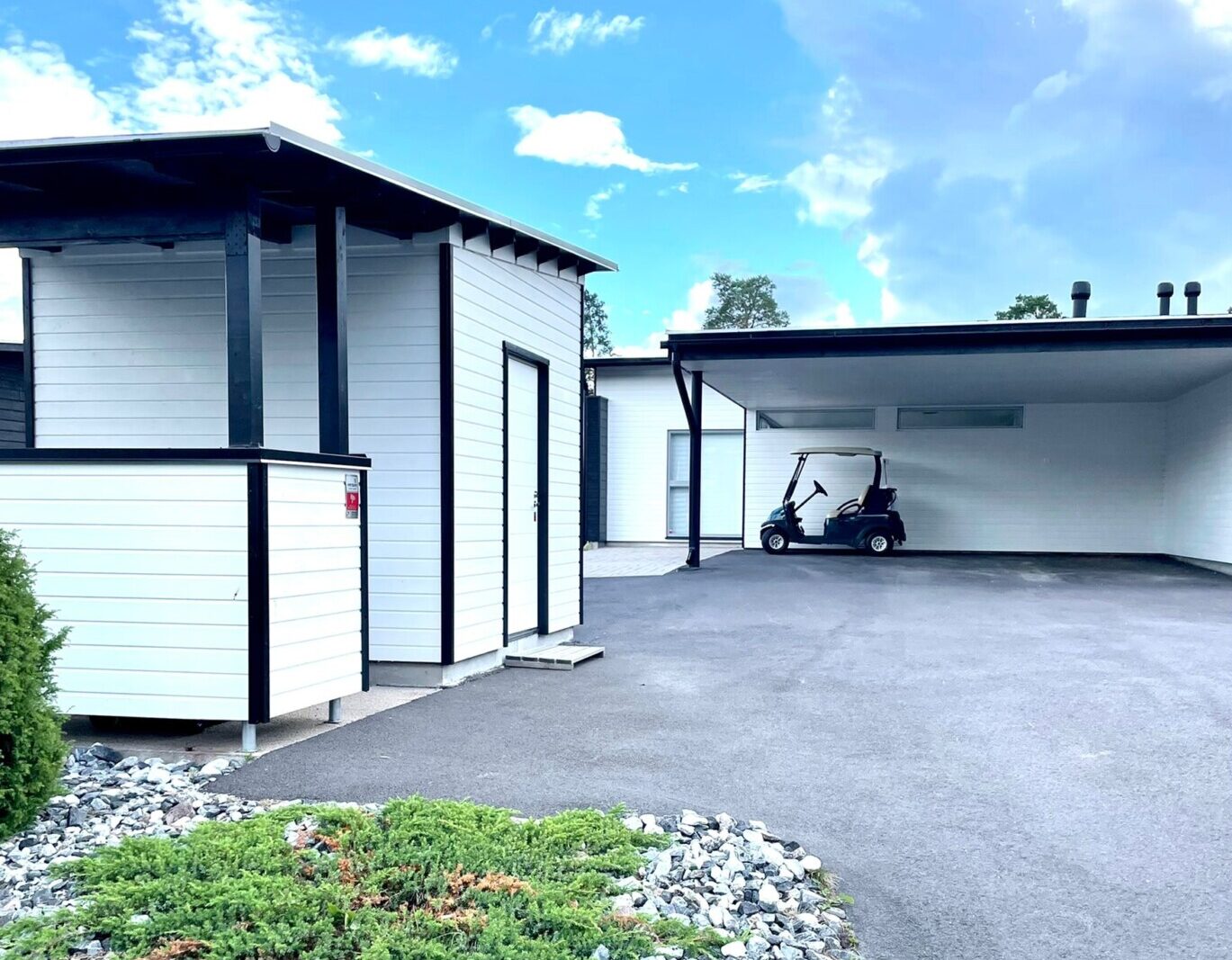 Huoneisto on rakennettu yhteen tasoon ja esteettömyys huomioitu rakentamisvaiheessa. Pysäköintipaikkoja lämpöpistokkeella löytyy autokatoksessa kahdelle autolle talon edestä.